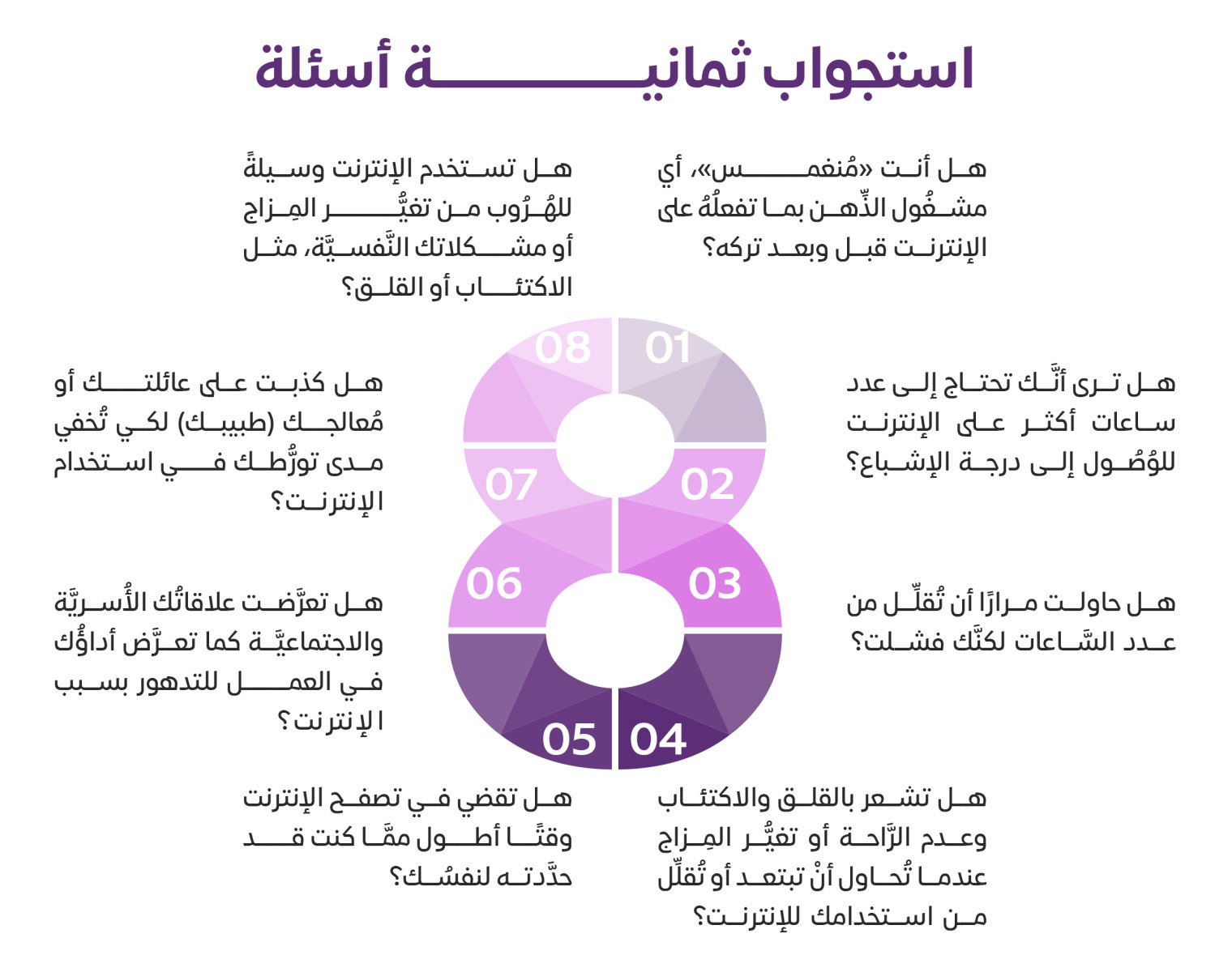 وهذه نماذج للأسئلة الَّتي يجب أنْ يطرحُها الشَّخص على نفسُه، وضعتها الطَّبيبة وعَالِمة النَّفس الأمريكيَّة كيمبرلي يونغKimberly Young، الَّتي تُعدُّ أوَّل أطباء علم النَّفس الَّذين عكفُوا على دراسة ظاهرة إدمان الإنترنت في الولايات المُتَّحدة الأمريكيَّة، بعُنوان: "استجواب ثمانية أسئلة"، والتي إن أجبت عن خمسة منها أو أكثر بـ "نعم"، فإن هذا يعني أنك مُدمن إنترنت، وجاءت الأسئلة جاءت كالآتي: