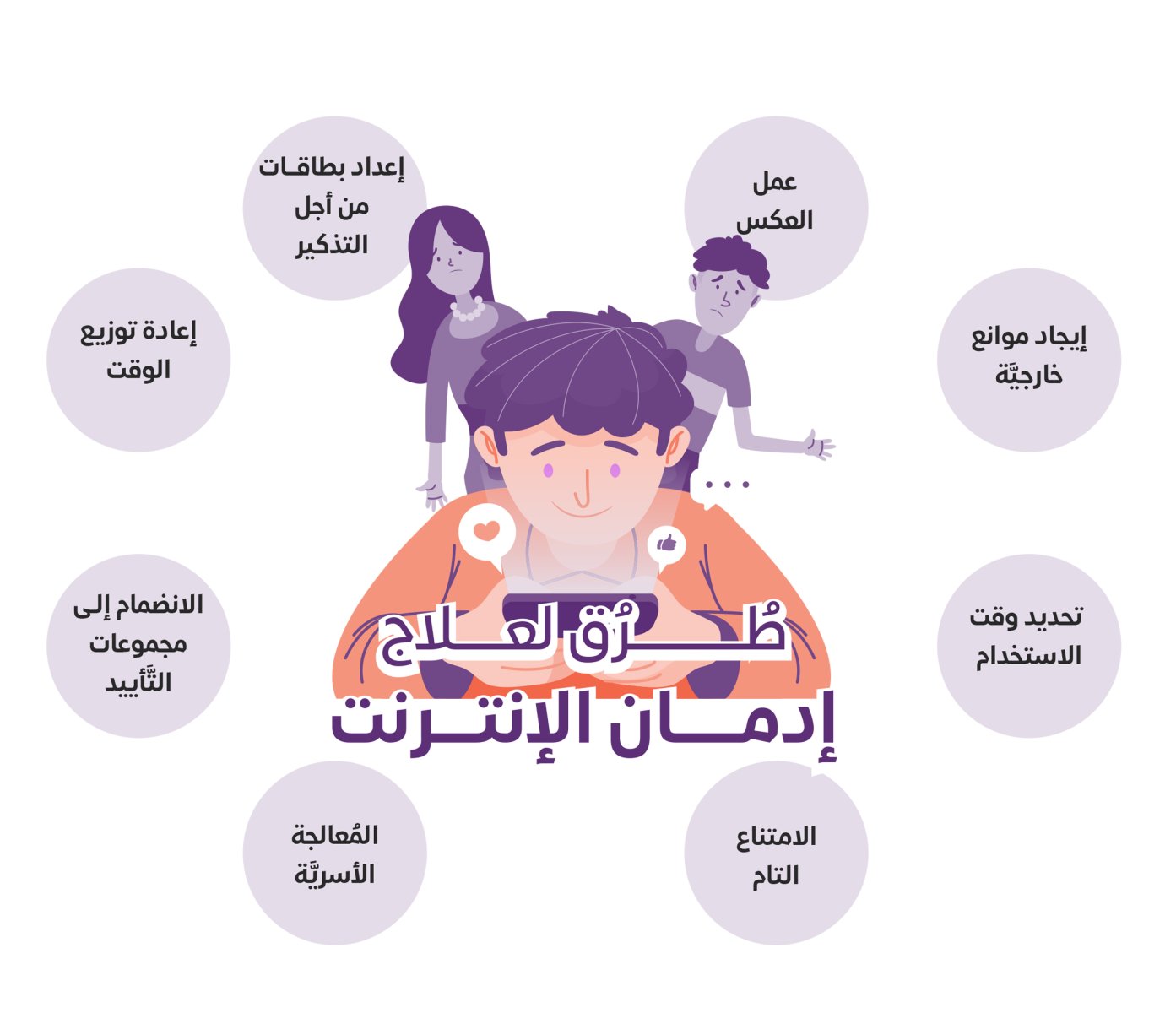 - إعادة توزيع الوقت: نطلُبُ من المريض أنْ يُفكِّر في الأنشطة التي كان يقُوم بها قبل إدمانه للإنترنت ليعرف ماذا خسر بإدمانه، كقضاء الوقت بالنادي مع الأُسرة، والقيام بزياراتٍ اجتماعيَّةٍ.. وهكذا. ثُمَّ نطلُبُ منه أن يُعاود مُمارسة تلك الأنشطة لعلَّه يتذكَّر طعم الحياة الحقَّة وحلاوتها.