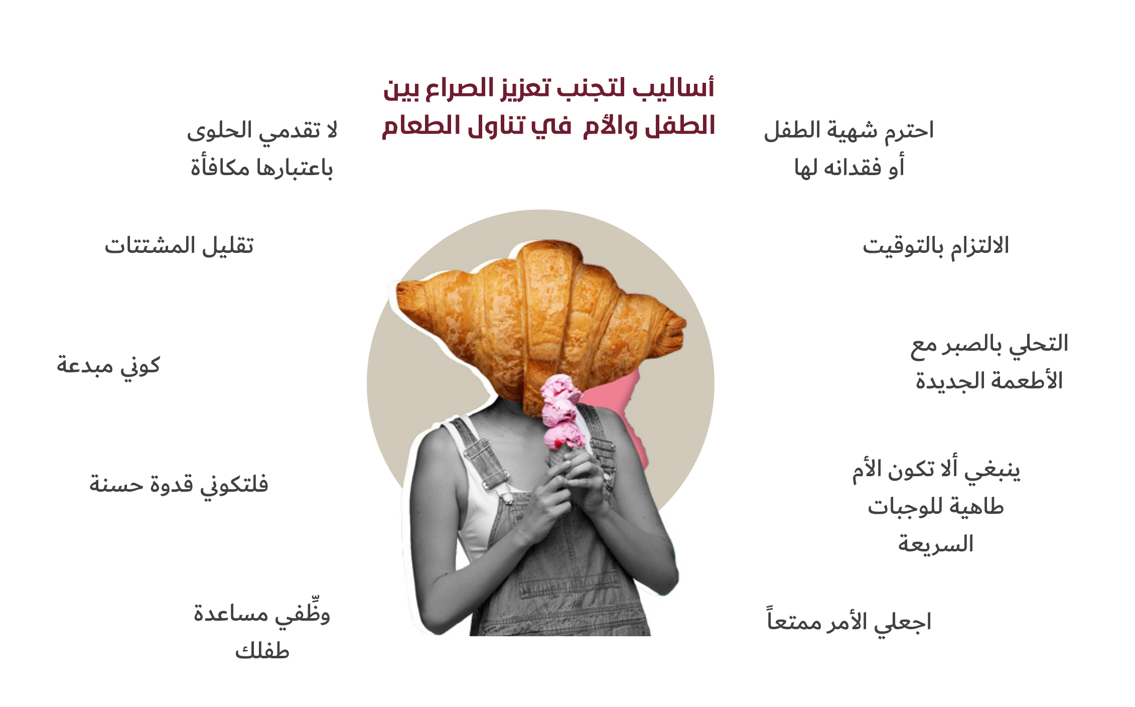لكي لا تكون تغذية الأطفال أمراً محبطاً، علينا اتباع أساليب مختلفة لتجنب تعزيز الصراع بين الطفل والأم ومساعدة الطفل صعب الإرضاء في تناول الطعام بين أفراد عائلته على اتباع نظام غذائي متوازن، من خلال: