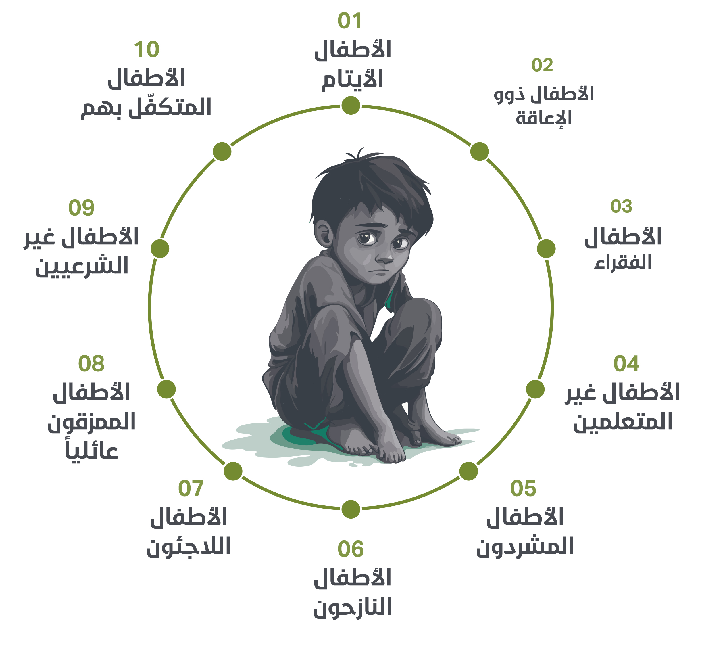 هذه القضية تعد قضية مجتمعية، حيث يطول التهميش عشرة فئات من الأطفال منهم: الأطفال الأيتام، والأطفال من ذوي الإعاقة، والأطفال المشردون، والأطفال غير الشرعيين، والأطفال المتكفل بهم، والأطفال الممزقون عائلياً، والأطفال النازحون واللاجئون، والأطفال الفقراء، والأطفال غير المتعلمين. ومن الأهمية التأكيد أن ظاهرة التهميش ظاهرة مؤسفة، لأنها تحرم الطفل من مباهج الحياة، كما أنه يأخذ شكل الحرمان من أبسط مقومات الحياة الكريمة، خاصة أن أعداد هذه الفئات بالملايين، ويجب أن نضمن لهم حقوقهم حتى لا يضطروا للجنوح.