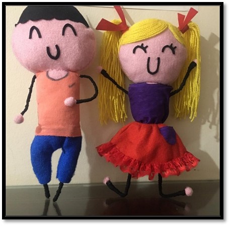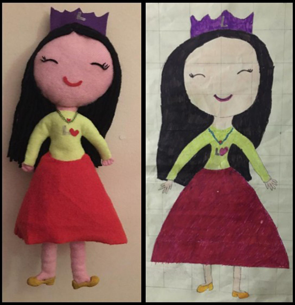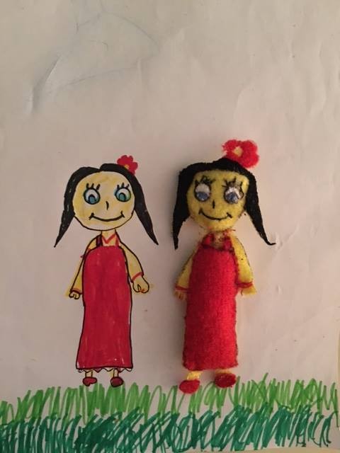 رغبةً مني في تخليد رسوماتهم المميزة وإدخال البهجة إلى نفوسهم، وتعزيز ما قاموا به لصقل مواهبهم ودعم ثقتهم بأنفسهم؛ قمت بتجسيد بعضها وتحويلها إلى عرائس سعدوا بها كثيراً، حيث أصبح بإمكانهم حملها واحتضانها والتحرك بها في كل مكان، أو وضعها في مكان بارز بغرفهم. كما تمكنت من تحويل بعضها إلى لوحات يمكن تعليقها على الحائط، وكانت بداياتي مع رسمتي التوأمين لارا وكارما، حيث حولتهما إلى عروستين صغيرتين لهما الشكل والحجم نفسه.