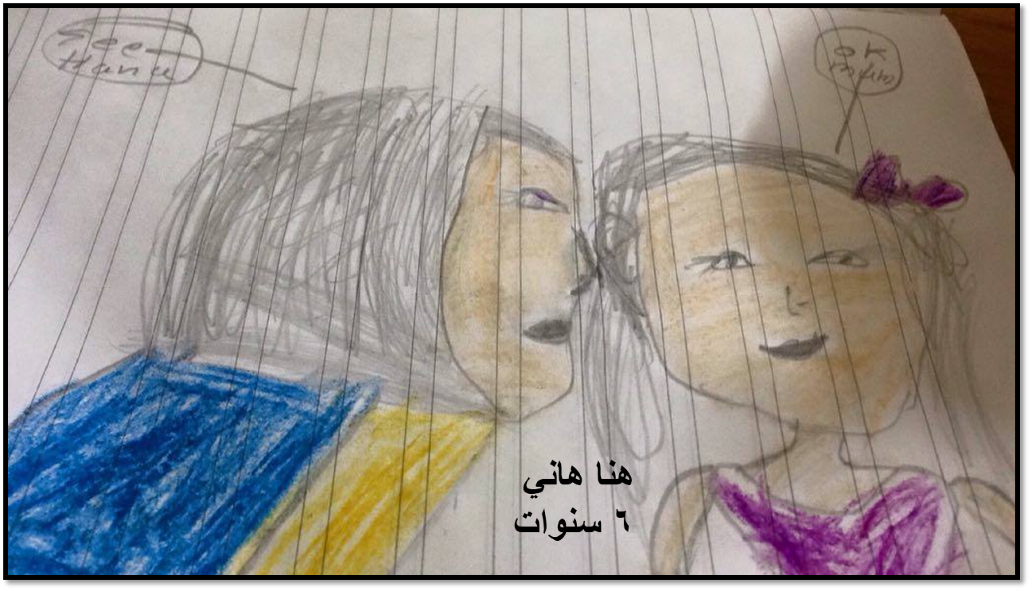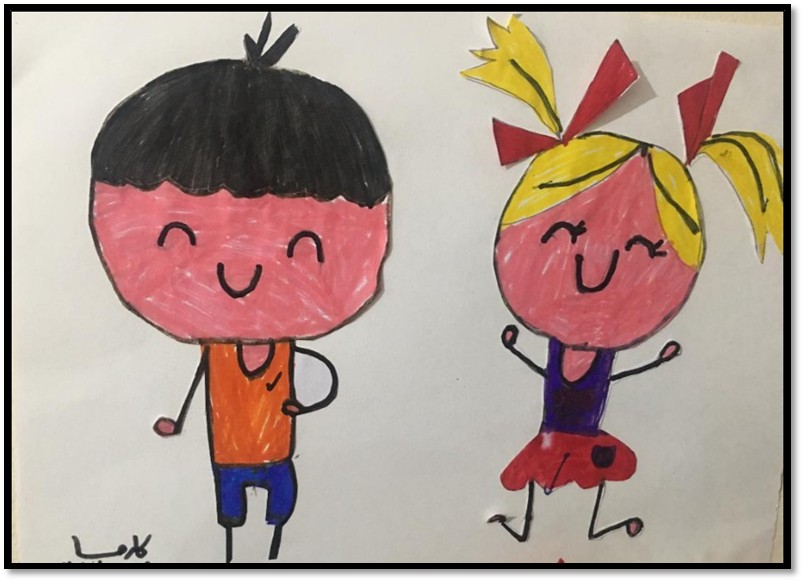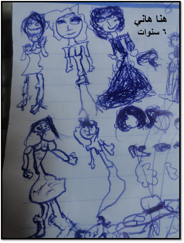 والحقيقة من خلال متابعتي لرسوم أحفادي اكتشفت أن بعضها تسبق سماته المرحلة الخاصة بالفئة العمرية التي ينتمون إليها؛ ففي سن الخمس سنوات (تحضير المدرك الشكلي) لفت انتباهي أن حفيدتي "كارما" قد تمكنت من رسم وجوه الشخصيات التي اختارتها على شكل دائرة كاملة الاستدارة وليس شبه دائرة كما هو متعارف عليه. بينما تطابق رسم اليدين والرجلين مع معالم رسوم المرحلة؛ حيث جاءا على شكل خطوط، أما رسم "لارا" للشخصية حين كان عمرها 9 سنوات (مرحلة إدراك المدرك الشكلي) فقد استطاعت أيضاً من خلاله تخطي مرحلتها للمرحلة اللاحقة (التعبير الواقعي) سواء في مقاييس جسم الشخصية التي قامت برسمها (باستثناء حجم الرأس بالنسبة إلى الجسم) أو في تفاصيل ملابسها. أما حفيدتي "هنَّا"، فالحقيقة أن رسمها للشخصيات وهي في عمر الخمس سنوات جاء مدهشاً ومميزاً بالنسبة إلى مرحلتها العمرية. ونظراً إلى كثرة خطوط الشخصيات التي قامت برسمها؛ كان من الصعب تجسيدها إلى عرائس، ولكنها تمكنت من رسم مواقف تعبّر عن سلوكيات جعلتني أتحمس لتحويلها إلى لوحات.