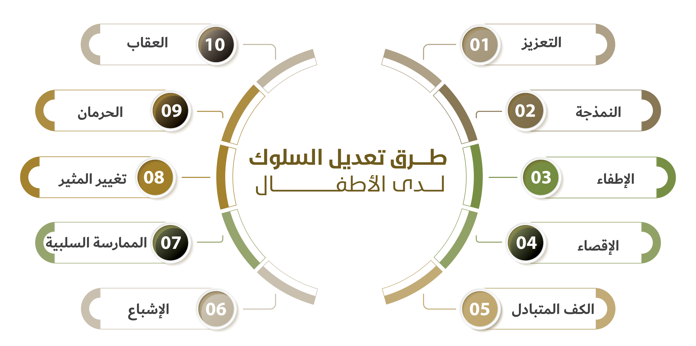 - الإطفاء: ويعني أن نتجاهل السلوك غير المرغوب فيه من الطفل؛ حتى يضعف ويتوقف نهائياً، فبعض الأطفال يعمل على لفت انتباه والدته بالبكاء الذي ليس له سبب، ولكن رغبةً من الطفل في حمله مثلاً، وعندما تتجاهل هذا السلوك من الطفل فإنه ينطفئ تدريجياً.