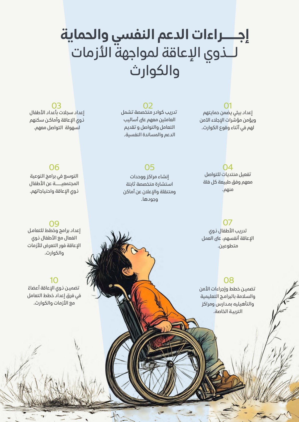 - وضع وإعداد برامج وخطط متخصصة وشاملة للتعامل المباشر والفعال مع الأطفال ذوي الاحتياجات الخاصة فور التعرض للأزمات والكوارث.