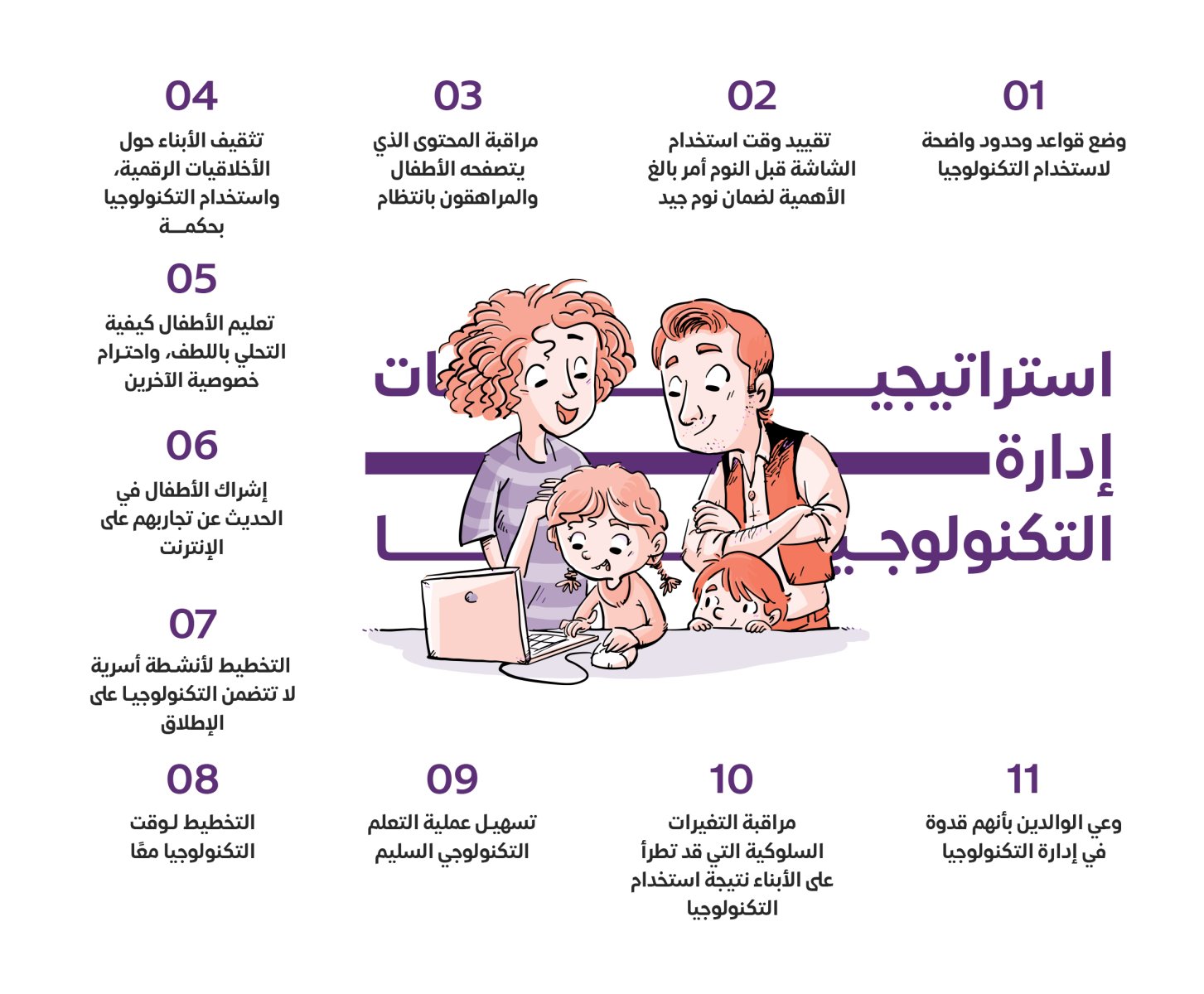 - وعي الوالدين بأنهم قدوة في إدارة التكنولوجيا؛ لذا ينبغي عليهم تبني سلوك أخلاقي ومسؤول على الإنترنت وخارجه، ليكونوا قدوة حسنة لأبنائهم.